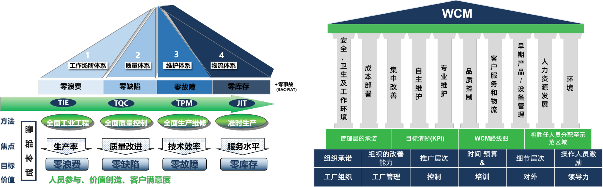 世界级制造(WCM:World Class Manufacturing)整合了精益管理、TPM、Six Sigma等管理方法,采用统一的语言实施运营管理,希望为企业打造一个以服务业务目标为主旨的管理体系,也就是世界级制造WCM。